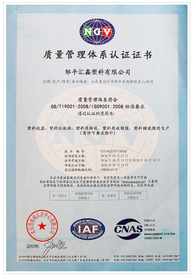 匯鑫塑料質量管理體系認證證書